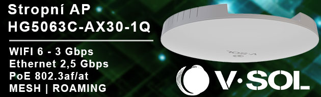 VSOL HG5063C-AX30-1Q (2.5GbE + WiFi6 AX3000) je nově uvedené stropní AP/router standardu WIFI 6, který je kompaktní, elegantní a snadno instalovatelný. Je vybaven 2.5GbE síťovým portem, který uživatelům poskytuje rychlejší a stabilnější síťové připojení. Podporuje napájení přes PoE, nabízí různorodé možnosti napájení a je flexibilní a snadno použitelný v hotelových halách, učebnách, konferenčních místnostech, restauracích a dalších prostředích. Je osazen výkonným čipsetem AX3000 a vestavěnou WiFi anténou, s bezdrátovou přenosovou rychlostí až 3000 Mbps, což uživatelům zajišťuje vynikající výkon.
