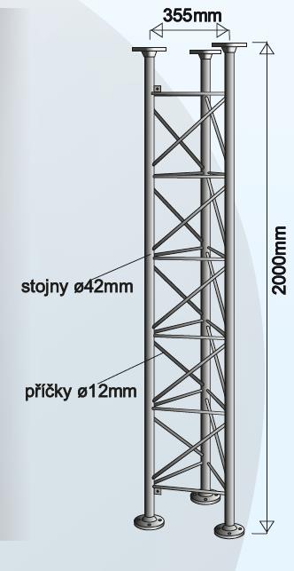 Robustní stohovatelný příhradový stožár o výšce 2m s trojúhelníkovou základnou.