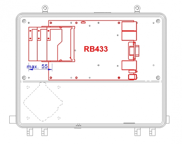 • V boxu je příprava pro snadnou montáž desek MikroTik: RB 411, RB911, RB912, RB433, RB493, ostatní pomocí vloženého plechu (není součástí balení)