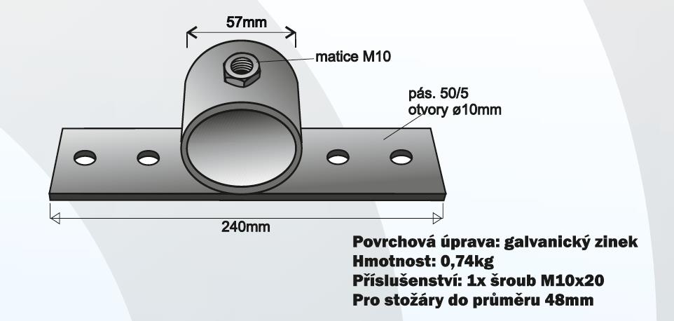Držák pro upevnění stožáru přímo na zeď s dlouhým pásem se čtyrmi otvory pro šrouby. Lze si vybrat pro jaký průměr stožáru bude použit do průměru 4,8cm