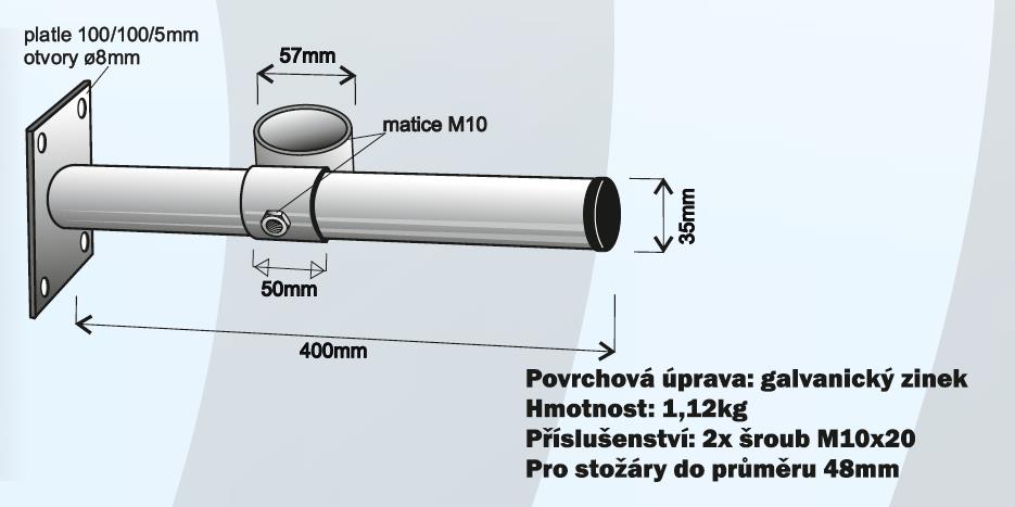 Držák se stavitelným odsazením pro stožár k upevnění na zeď nebo do krovu s plotnou se čtyřmi otvory pro šrouby. Součástí balení 2 šrouby (šestihran M10x20).