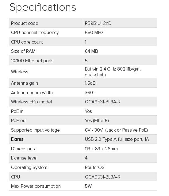 Osazeno 650MHz CPU, 64MB RAM, disponuje pěti Fast Ethernet porty, integrovaný Dual-Chain 2.4GHz 158mW bezdrátový modul a RouterOS L4 licence.