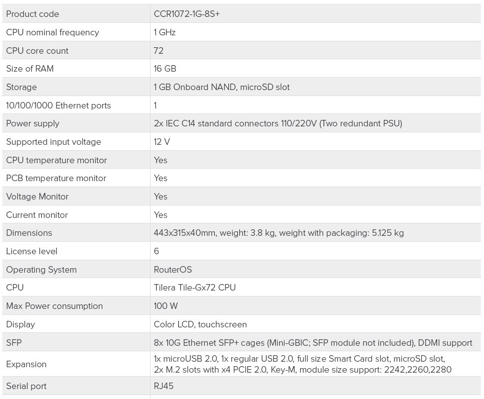 Cloud Core Router je osazen osmi nezávisle připojenými 10G SFP+ porty přímo k CPU, dodává se v hliníkovém indoor case v provedení rack 1U s křidélky.