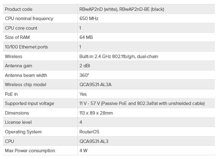 Výroba modelu končena, produktový nástupce/ekvivalent: wAP ac nebo cAP RBwAP2nD je designové vodotěsné ápéčko disponující kompletním servisem RouterOS funkcí určené k montáži na strop či na stěnu pro pokrytí signálem v indoor aplikacích. Ideální řešení pro pokrytí signálem v domácích sítích, veřejných prostranstvích typu hotelů, letišť, nákupních center apod. Disponuje jedním 10/100 Ethernet portem, je dostupné ve dvou barevných provedeních (černá/bílá). Montážní platforma umožňuje snadné nasazení i sundání aktivního prvku, nerušivé vedení erthernet kabelu spodem jednotky. Přístup do spodního krytu jednotky je řešen bezpečnostním šroubem proti vniknutí a odcizení prvku. Podporuje normy 802.11b/g/n, napájení prostřednictvím PoE. Zdroj, PoE slučovač i montážní příslušenství jsou součástí dodávky. Správa prostřednictvím MikroTik CAPsMAN (controlled AP system manager), umožňující kontrolu zařízení z jedné centrální lokace. TECHNICKÉ SPECIFIKACE Product code: RBwAP2nD CPU nominal frequency: 650 MHz CPU core count: 1 Size of RAM: 64 MB 10/100 Ethernet ports: 1 Wireless Built-in: 2.4 GHz 802.11b/g/n, dual-chain Antenna gain: 2 dBi Antenna beam width: 360° Wireless chip model: QCA9531-AL3A PoE in: Yes Supported input voltage: 11 V - 57 V (Passive PoE and 802.3af/at with unshielded cable) Dimensions: 113 x 89 x 28 mm Router OS license level: 4 CPU: QCA9531-AL3 Max Power consumption: 4 W ! UPOZORNĚNÍ ! Výrobce Mikrotik neposkytuje záruku na zařízení poškozená přepětím. Zařízení je třeba adekvátně chránit proti indukovanému elektrostatickému přepětí či přepěťovým špičkám na silovém vedení. Pro venkovní instalace používat výhradně stíněnou kabeláž (FTP/SFTP) a jednotky korektně uzemnit (prostřednictvím integrovaného zemnícího členu či použitím ethernetové přepěťové ochrany).