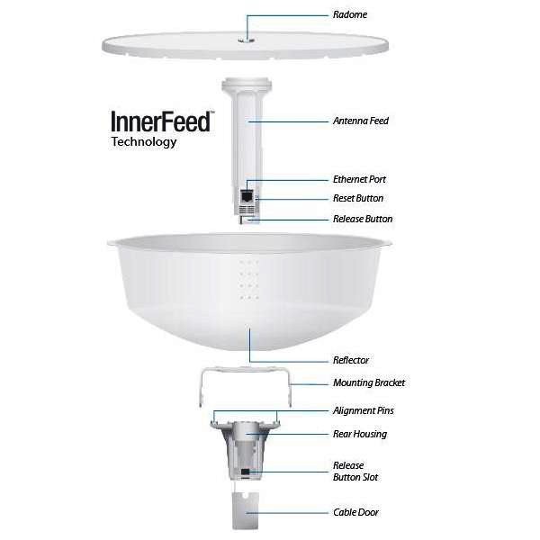 Snadná montáž antény díky technologii Inner Feed, možnost elevace sklonu antény o ±20° pro přesné zaměření spoje.