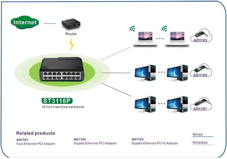 Netis ST3116P Fast Ethernet Switch poskytuje šestnáct 10/100Mbps Auto-Negotiation RJ45 portů. Je ideálním řešením pro malé a střední kanceláře. Všechny porty podporují Auto MDI/MDIX funkci, která eliminuje potřebu křížených kabelů nebo uplinkových portů.