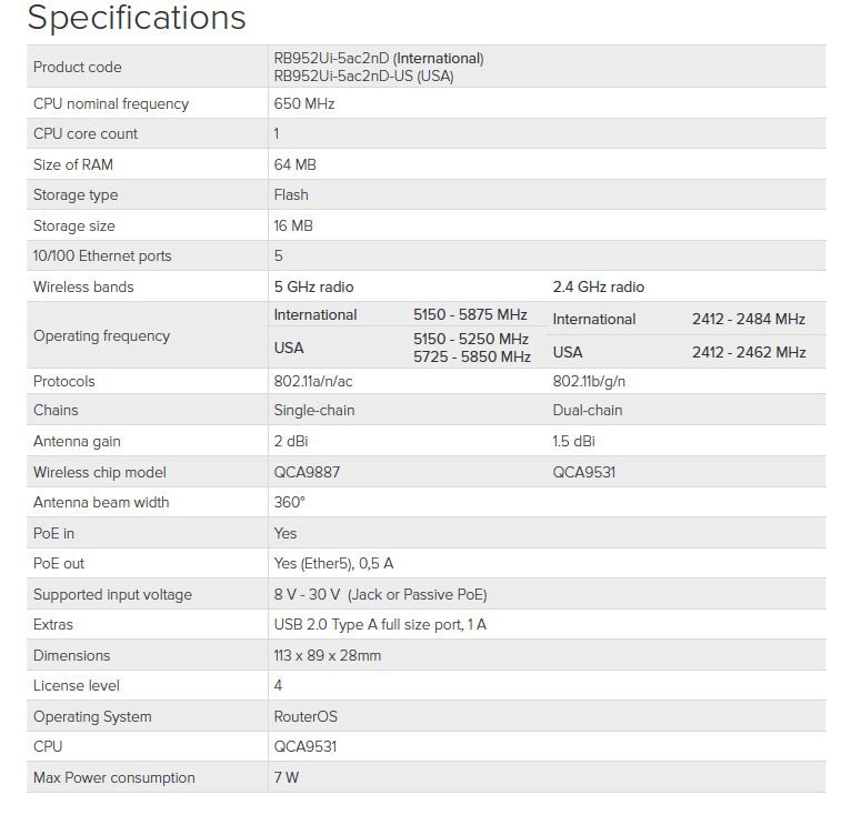 Založen na 650MHz CPU, osazen 64MB RAM, disponuje pěti 10/100Mbps Ethernet porty (PoE výstup na portu 5).
