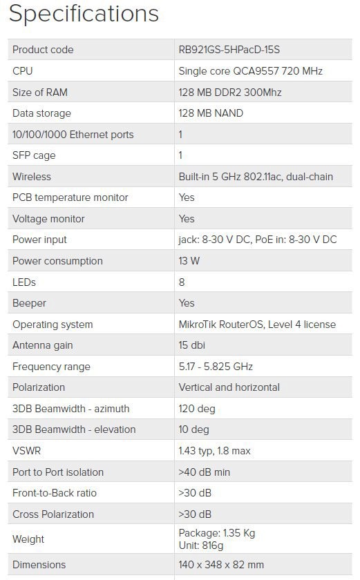 V těle antény integrován routerboard RB921 (720MHz CPU) s integrovaným 802.11ac/a/n bezdrátovým modulem a regulovatelným výkonem až 31dBm.