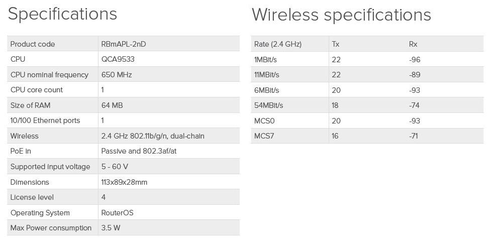 mAP lite je miniaturní 802.11 b/g/n dual-chain ápéčko disponující kompletním servisem RouterOS funkcí s předinstalovanou RouterOS level 4 licencí.