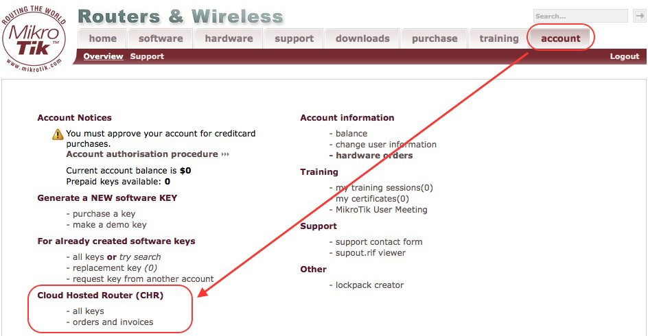 1. stáhněte instalační balíček - image pro Cloud Hosted Router!