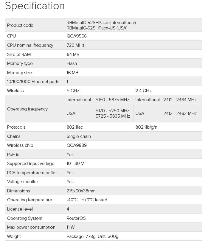 Metal 52 ac podporuje 802.11 b/g/n při 2.4GHz a 802.11 ac/n/a při 5GHz s výkonem až 1300mW.