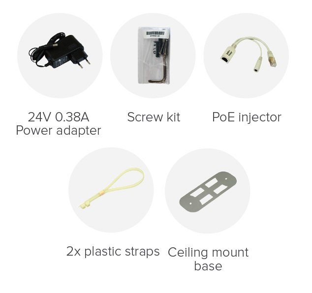 Součástí balení je kromě PoE splitteru, zdroje a držáku také speciální šroub, který zamezuje neoprávněnému vniknutí do zařízení.