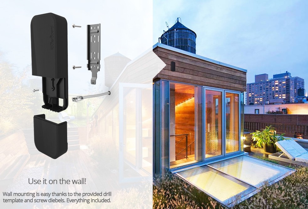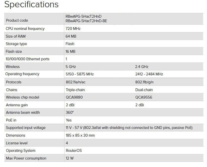 Zařízení má na ethernetové i rádiové části integrovanou přepěťovou ochranu, součástí je software RouterOS s předinstalovanou licencí L4, integrovaný PoE splitter pro napájení přímo po UTP kabelu.