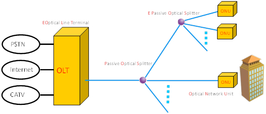Pasivní optická síť (PON, Passive Optical Network) se skládá ze zakončení optického vedení (Optical Line Termination, OLT) na centrální straně sítě, na něž se připojují rozvětvenou strukturou optické rozbočovače – splittery. K nim se připojují koncové optické síťové jednotky (Optical Network Unit, ONU) nejčastěji do stromové, případně kruhové nebo hvězdicové topologie. Vzdálenost mezi OLT a ONU může být až 20km.