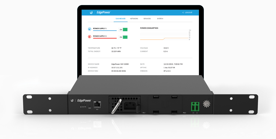 Edgepower je výkonné rackmount napájecí řešení s webovým managementem vhodné pro napájení EdgePoint routerů a switchů.