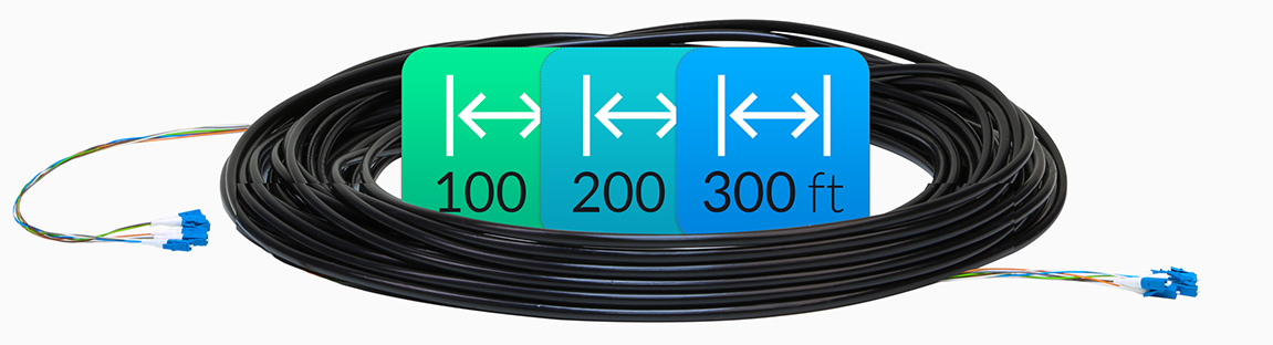 FC-SM-100 je 30ti metrový venkovní single mode optický kabel s 6ti předvyrobenými LC konektory na každé straně.