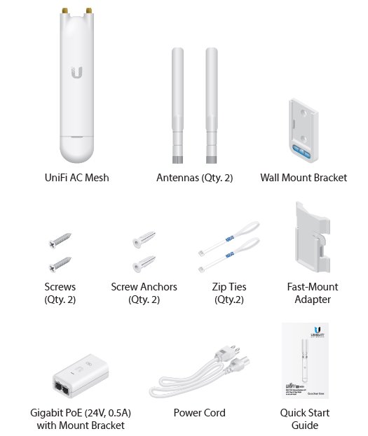 UniFi AC Mesh má dvě voděodolné všesměrové odnímatelné antény pro pásmo 2,4GHz (3dBi) a 5GHz (4dBi), které v případě potřeby je možné nahradit sektorovou anténou.
