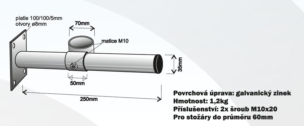 Držák se stavitelným odsazením pro stožár k upevnění na zeď nebo do krovu s plotnou se čtyřmi otvory pro šrouby. Součástí balení 2 šrouby (šestihran M10x20).