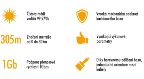 Tento instalační kabel s označením SXKD-5E-FTP-PVC je spolehlivou součástí produktové řady Solarix - CAT5E. Společně s ostatními komponenty systému strukturované kabeláže Solarix vytváří řešení, které zaručuje dlouhou životnost, maximální výkon a bezproblémový chod počítačové sítě. Instalační kabely Solarix – kategorie 5E jsou určeny pro horizontální rozvody a jsou nabízeny ve stíněné i nestíněné verzi s různým typem pláště - tj. PVC, LSOH nebo UV stabilní PE. Tyto kabely bez problémů splňují požadavky definované v mezinárodních standardech ANSI/TIA/EIA 568, ISO/IEC 11801 a EN 50173 pro kategorii 5E a jsou vhodné i pro přenos dat rychlostí až 1 Gb/s (tj. gigabitový Ethernet). Stejně jako ostatní kabely Solarix, je i kabel SXKD-5E-FTP-PVC značen metráží po 1m v rozsahu od 0 do 305m. Kabel je dodáván ve vysoce odolném třívrstvém leštěném kartónovém boxu (vždy barevně odlišeném podle typu kabelu), na kterém jsou uvedeny všechny nezbytné produktové informace, včetně čárových kódů, výrobní šarže, popisu a nejdůležitějších technických parametrů (např. NVP v podobě QR kódu).