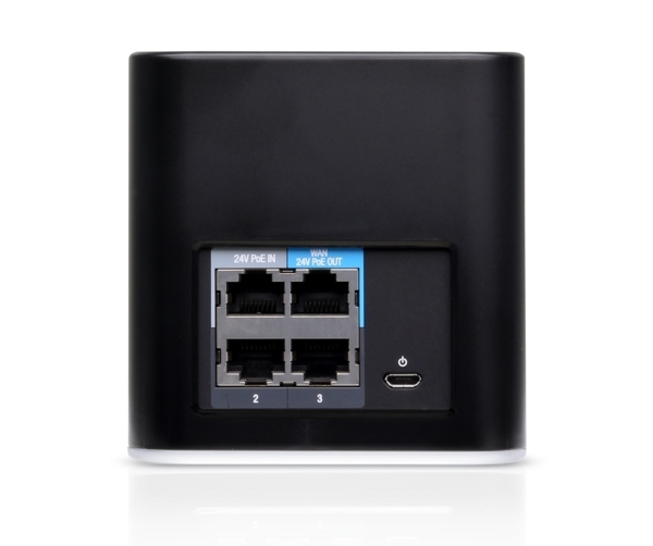 AirCube ISP disponuje čtyřmi RJ45 porty - dva porty jsou PoE. Port PoE IN slouží pro napájení samotného routeru, port PoE Out podporuje pasivní PoE 24V na výstupu.