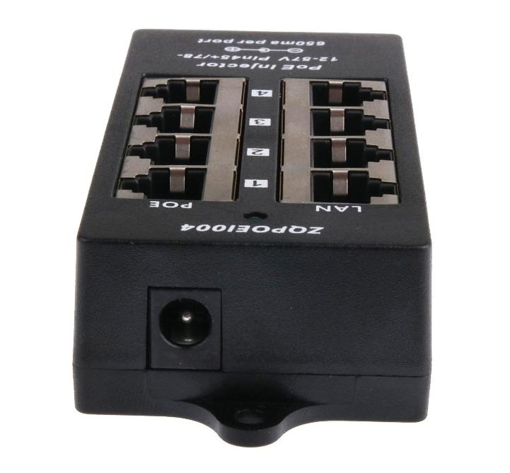 Do RJ45 konektorů na jedné straně se připojují ethernetové porty bez napájení (např. switch), na opačnou stranu se připojují zařízení využívají napájení po ethernetovém kabelu.