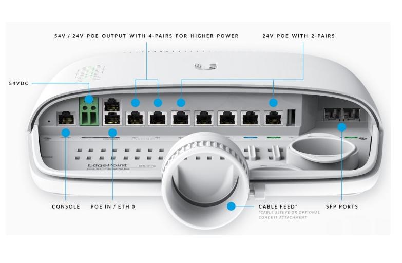 EdgePoint EP-R8 od Ubiquiti Networks je Gigabitový Router ve venkovním provedení s podporou výstupního POE na 7 ethernetových portech, vstupního POE portu pouze pro napájení a jedním GB LAN portem bez POE.