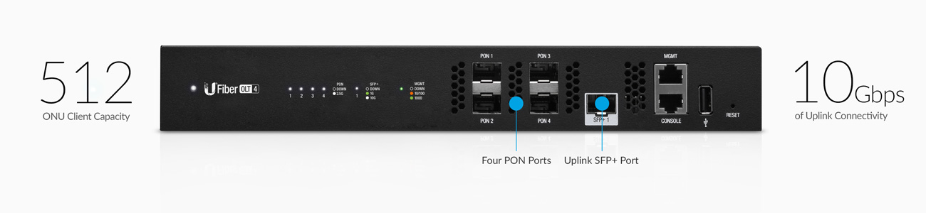 UFiber 4 OLT obsahuje čtyři GPON porty, jeden 1G/10G SFP+ port, RJ45 port konzole a RJ45 port pro management.