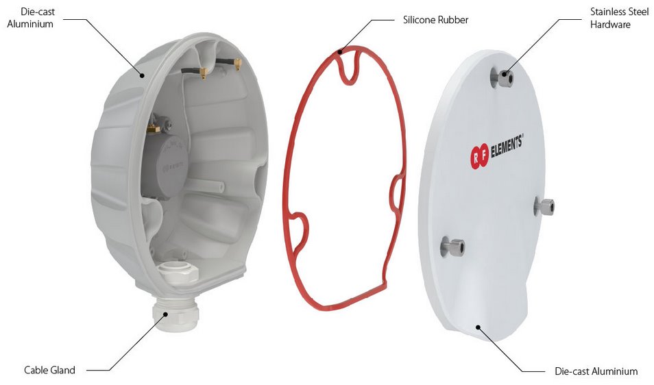 TPA-RBC nabízí vedle kabelové průchodky pro ethernetový kabel také tři předlisované otvory pro RSMA konektory pro připojení dalších antén.