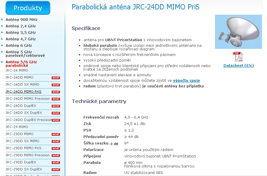 anténa pro UBNT PrismStation s vlnovodovým bajonetem, hluboká parabola zvyšuje izolaci mezi jednotlivými anténami na stožáru a zlepšuje vyzařovací diagram, precizní, masivní držák JDMW-900 vyvinutý pro profesionální mikrovlnné spoje