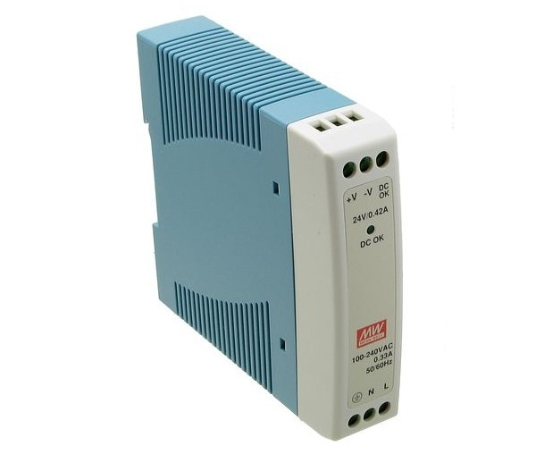 Profesionální spínaný napájecí zdroj Mean Well na DIN lištu s rozšířeným rozsahem provozních teplot s výstupním napětím 24V a výstupním proudem 20W pro aktivní prvky s odpovídajícím napájecím rozsahem.