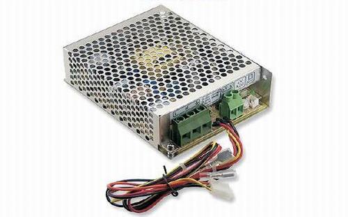 Profesionální spínaný napájecí zdroj Mean Well v kovové krabičce se svorkovnicí a vodiči k připojení záložného akumulátora, zdroj je vhodný pro zabezpečovací systémy.