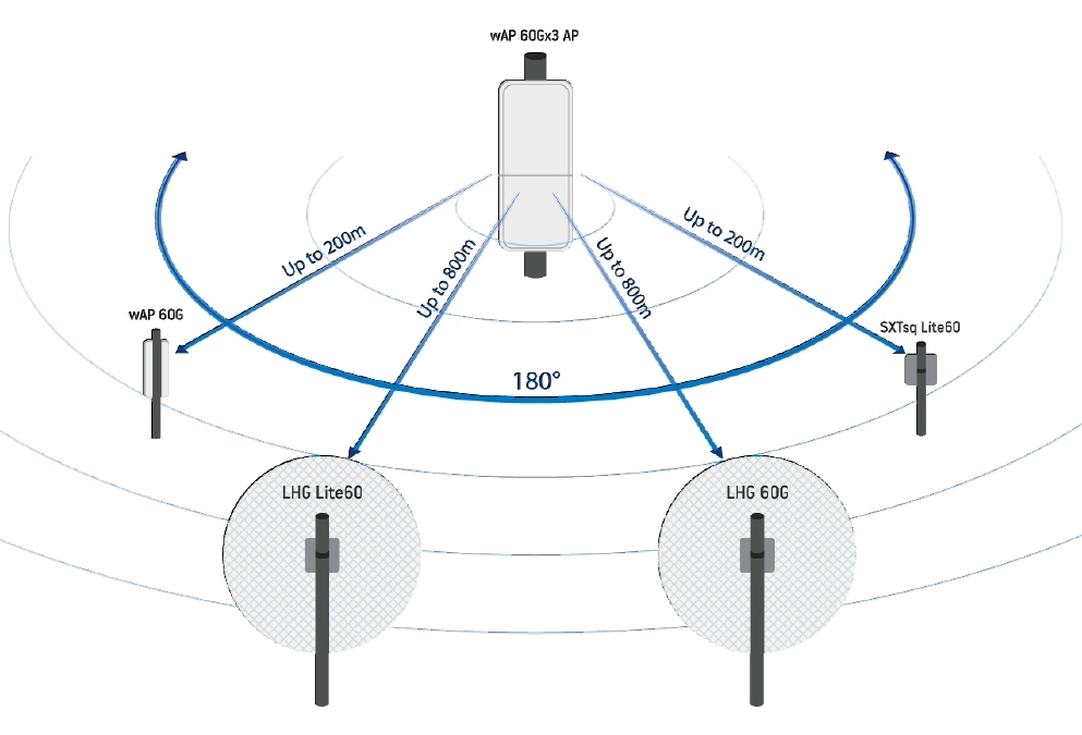 96-prvkové anténní těleso s beamformingem umožní efekrivní připojení až osmi klientských 60GHz stanic v 180° horizontalním pokrytí.