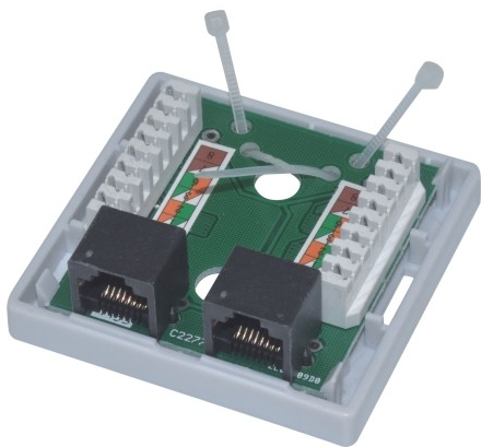 Dvojitá UTP datová zásuvka bílá s instalací na omítku. Jedná se o nestíněnou verzi s 2x RJ45, CAT5e svorkovnicemi typu 110 na jejíž instalaci potřebujete nástroj typu Krone / Boxer. Velikost 60 x 62 x 26mm