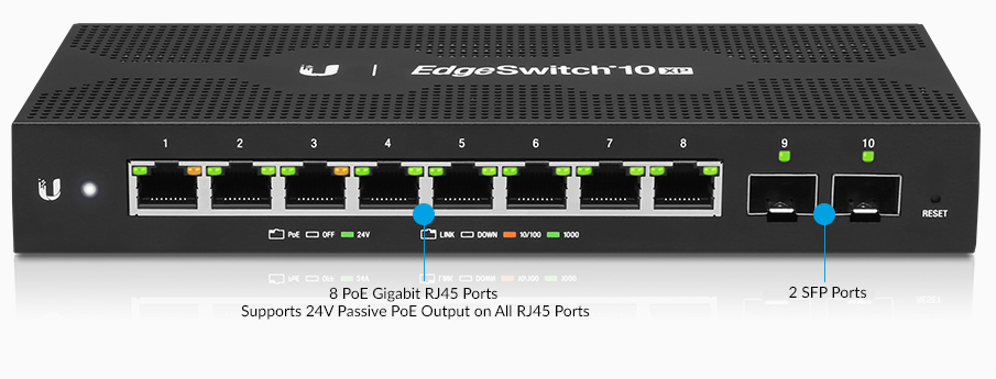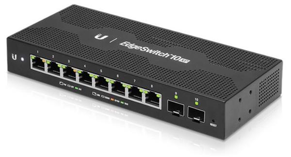 EdgeSwitch 10XP je nastavitelný switch s 8 ethernetovými porty a 2 SFP porty pro připojení do optické sítě.