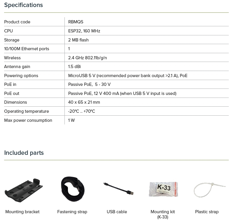 PoE out: Passive PoE, 12 V 400 mA (when USB 5 V input is used)