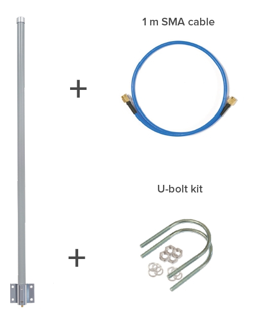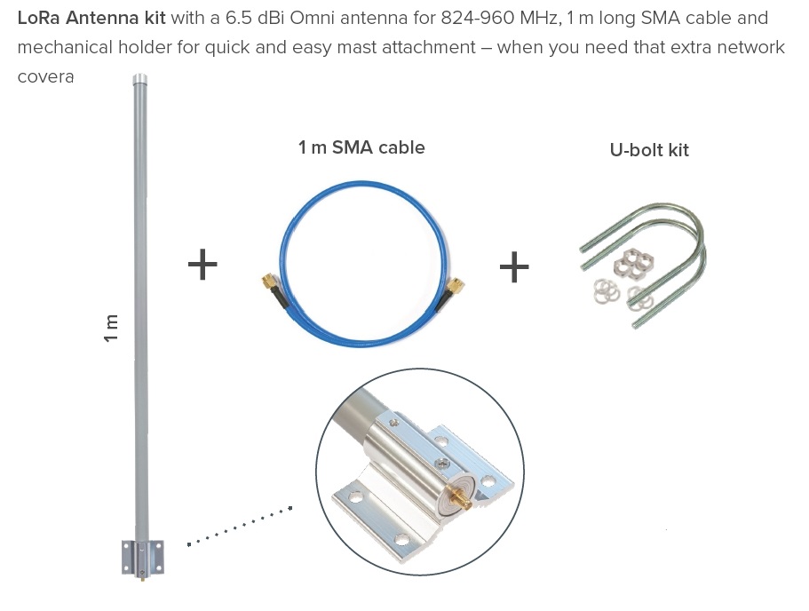 Kit obsahuje externí 6.5dBi Omni anténu pro frekvenční pásmo 824-960 MHz. Dodávána spolu s 1m dlouhým SMA/SMA redukčním kabelem a držákem na stožár (o průměru 30-50mm).