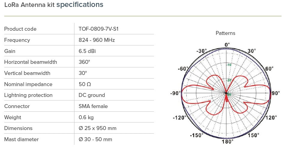 Kit obsahuje externí 6.5dBi Omni anténu pro frekvenční pásmo 824-960 MHz. Jedná se o přepracovanou sadu antény pro LoRa® systémy - nová sada nabízí výrazně vyšší odolnost v menším balení a to bez ztráty výkonu.