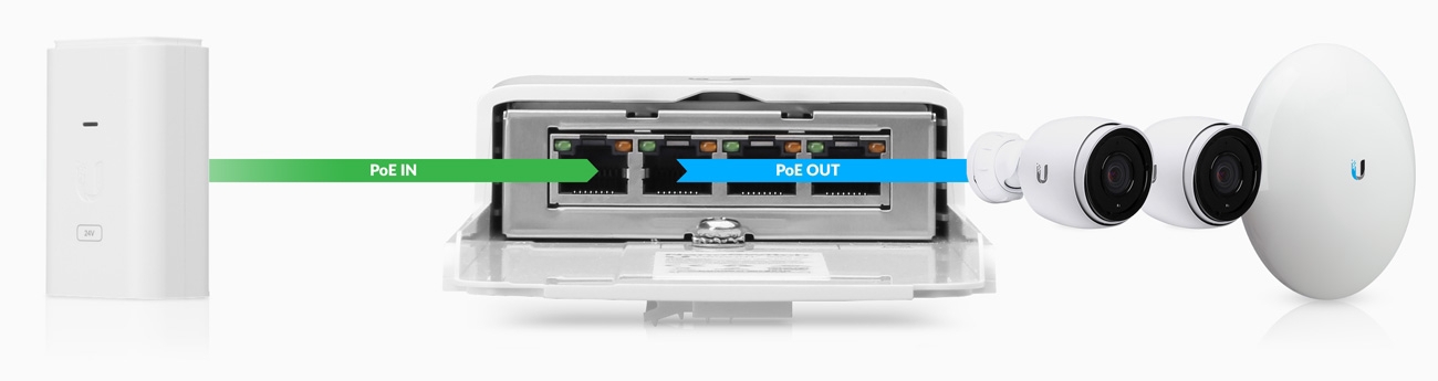 Zbylé 3 porty slouží pro napájení dalších zařízení s podporou 24V pasivního Gigabit PoE s podporou napájení po 2 párech (standard pro zařízení typu NanoStation, PowerBeam, AirGrid atd.).