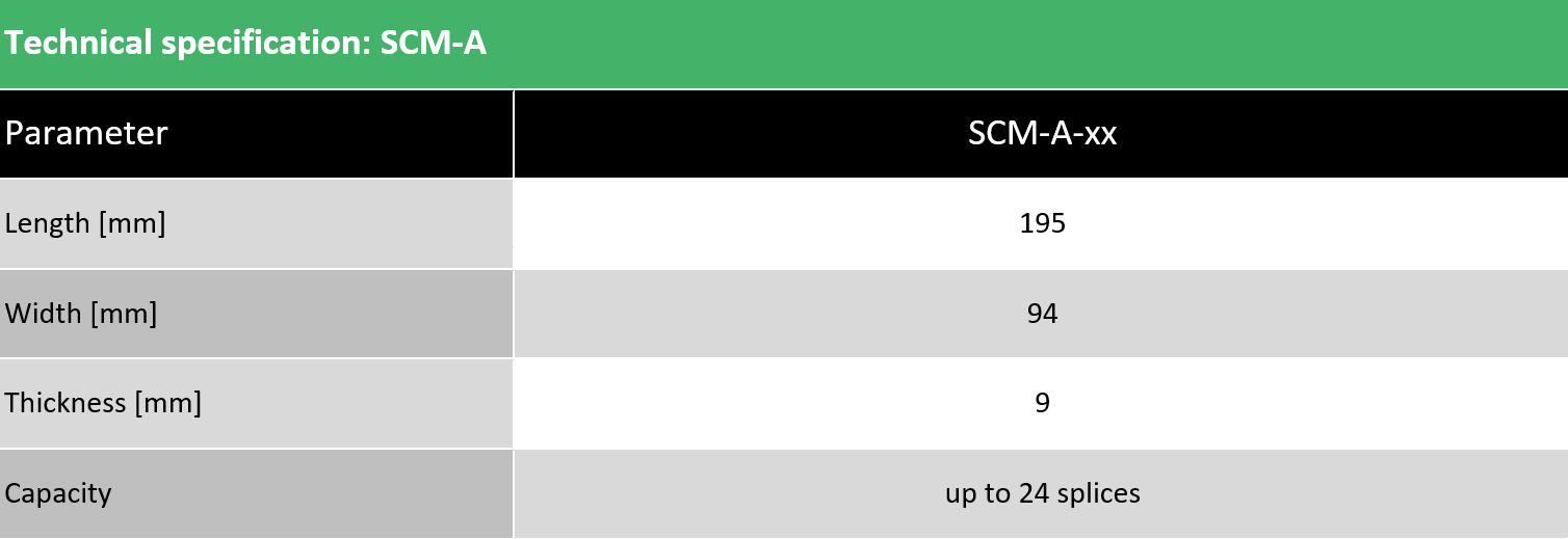Optická kazeta SCM-A-XX je prvkem, který sa používa v optických zařízeních, jako jsou skříně, moduly optických vláken, aby se zaručilo uskladnění extra délky vlákna a ochrany spojů. Optimalizovaný tvar kazety ulehčuje efektivní umístění vláken.
