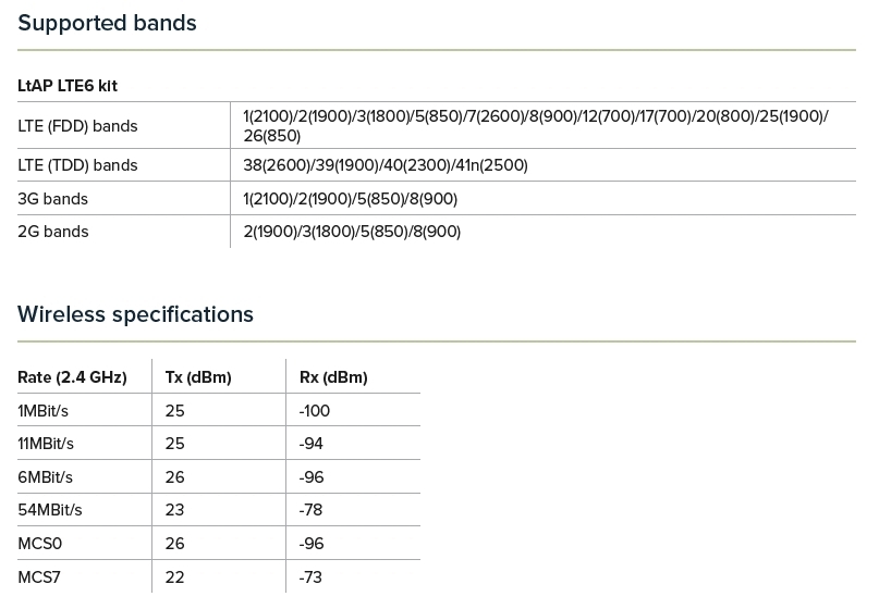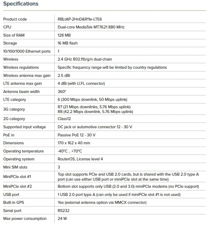 LtAP LTE kit je osazen dvoujádrovým 880MHz CPU a pamětí 128MB RAM, 1x Gigabit Ethernet LAN portem, USB vstupem a integrovaným radio modulem 2.4GHz dual chain 802.11b/g/n.