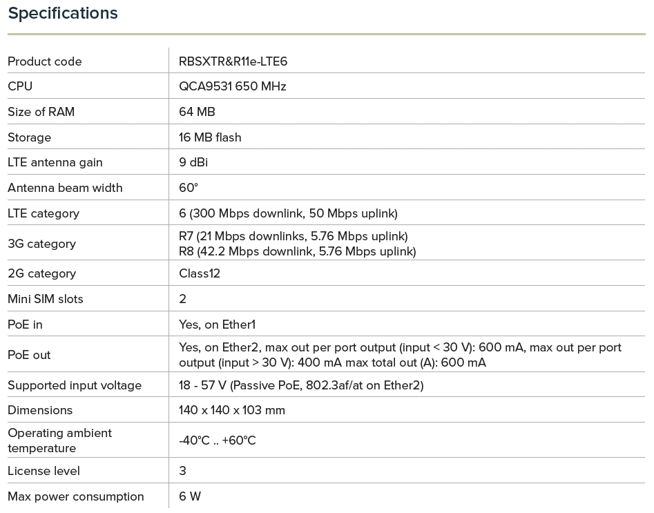 SXT LTE6 je 802.11b/g/n modelem řady SXT s integrovaným kvalitním LTE modemem kategorie6 umožňujícím 300 Mbit/s downlink a 50 Mbit/s uplink..