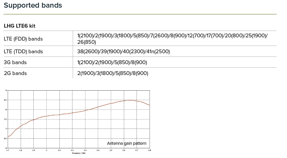LTE (FDD) bands 1(2100)/2(1900)/3(1800)/5(850)/7(2600)/8(900)/12(700)/17(700)/20(800)/25(1900)/26(850)