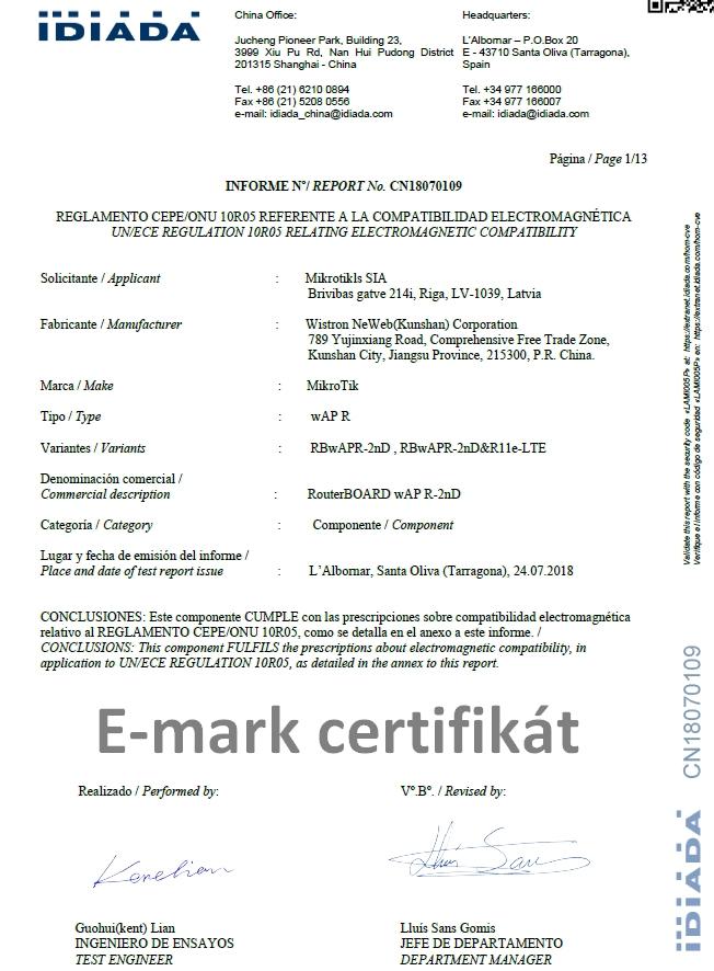 K produktu vystaven E-mark certifikát.