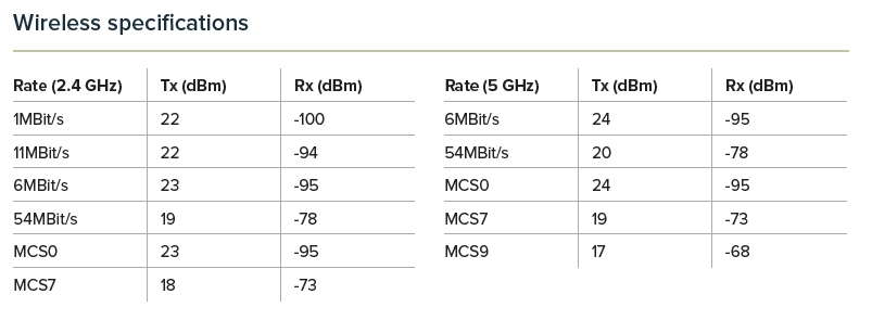 Wireless 2.4 GHz 802.11b/g/n dual-chain, 5 GHz 802.11a/n/ac dual-chain