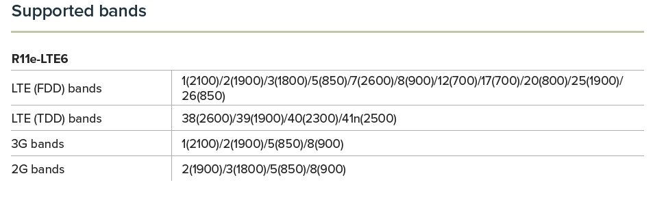 LTE (FDD) bands 1(2100)/2(1900)/3(1800)/5(850)/7(2600)/8(900)/12(700)/17(700)/20(800)/25(1900)/26(850)