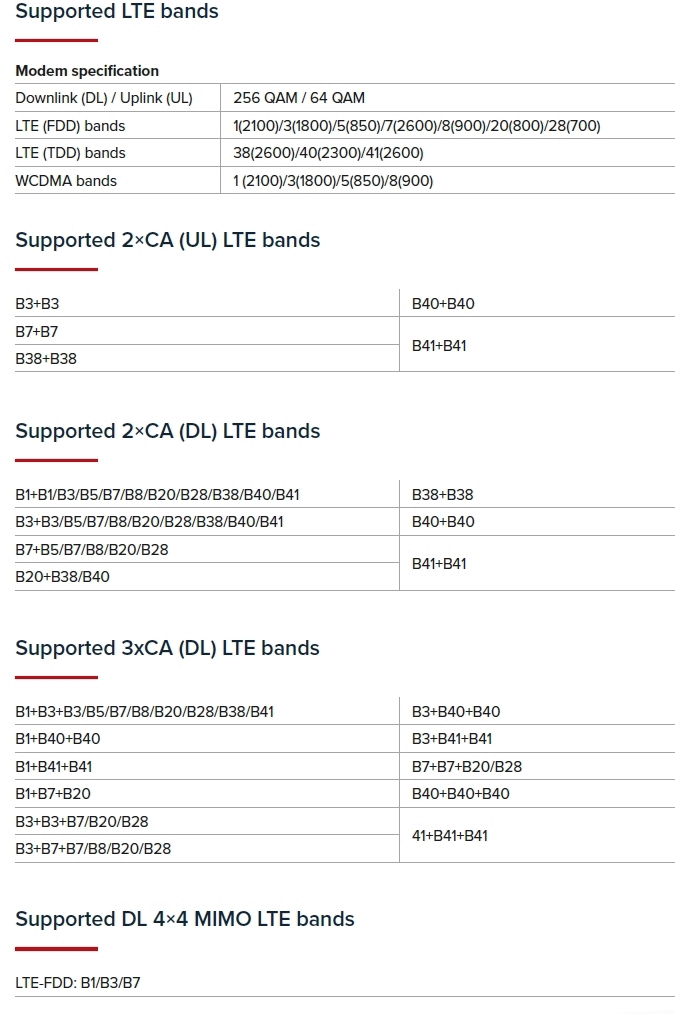 LTE category: 12 (600 Mbps Downlink, 150 Mbps Uplink), the LTE chip is built-in, 4x4 MIMO LTE support
