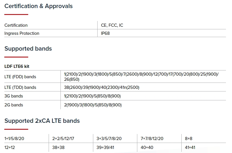 LTE (FDD) bands: 1(2100)/2(1900)/3(1800)/5(850)/7(2600)/8(900)/12(700)/17(700)/20(800)/25(1900)/26(850)