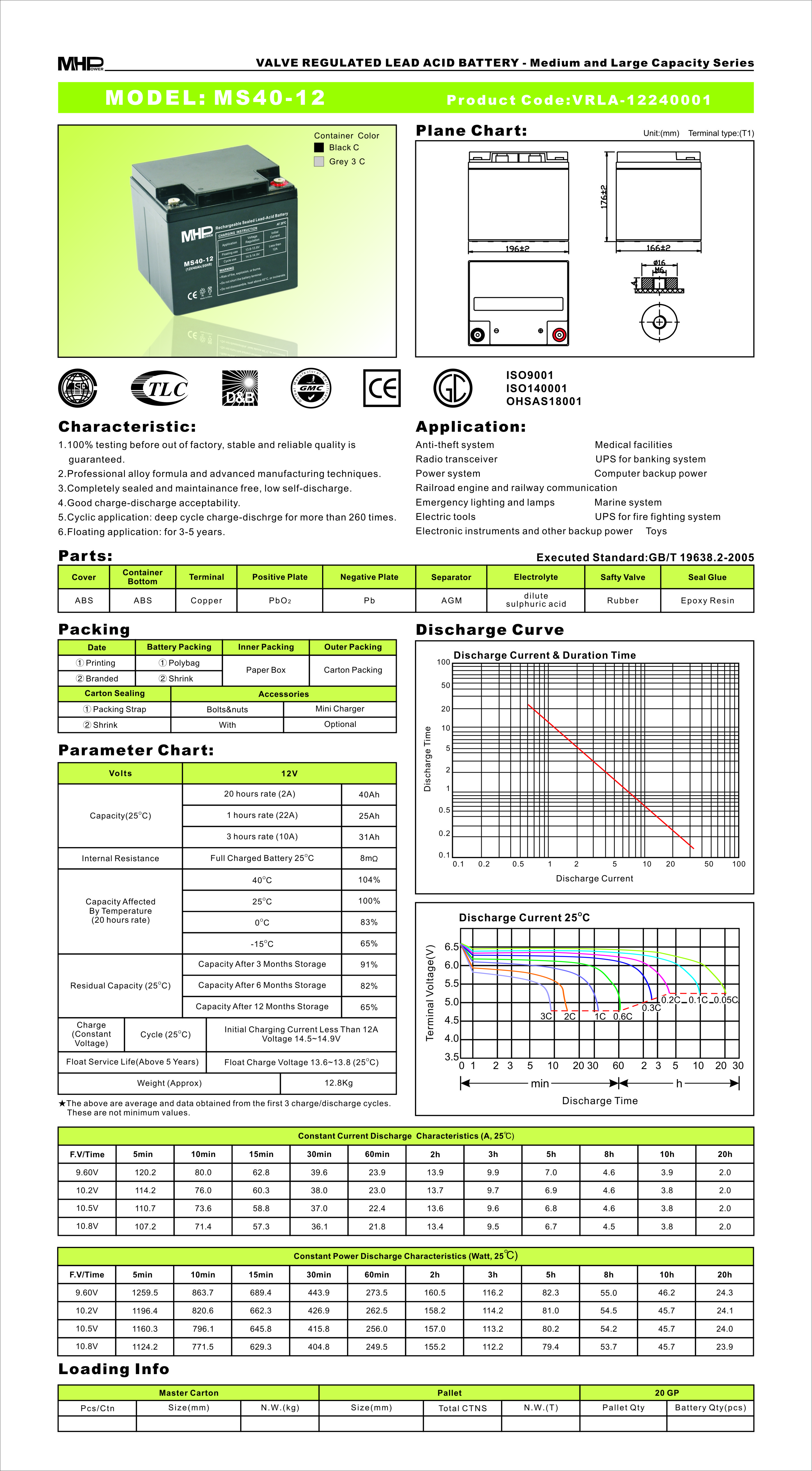 MHPower battery • MS40-12 • MHPower olověný akumulátor AGM 12V/40Ah, Terminál T1 - M6
