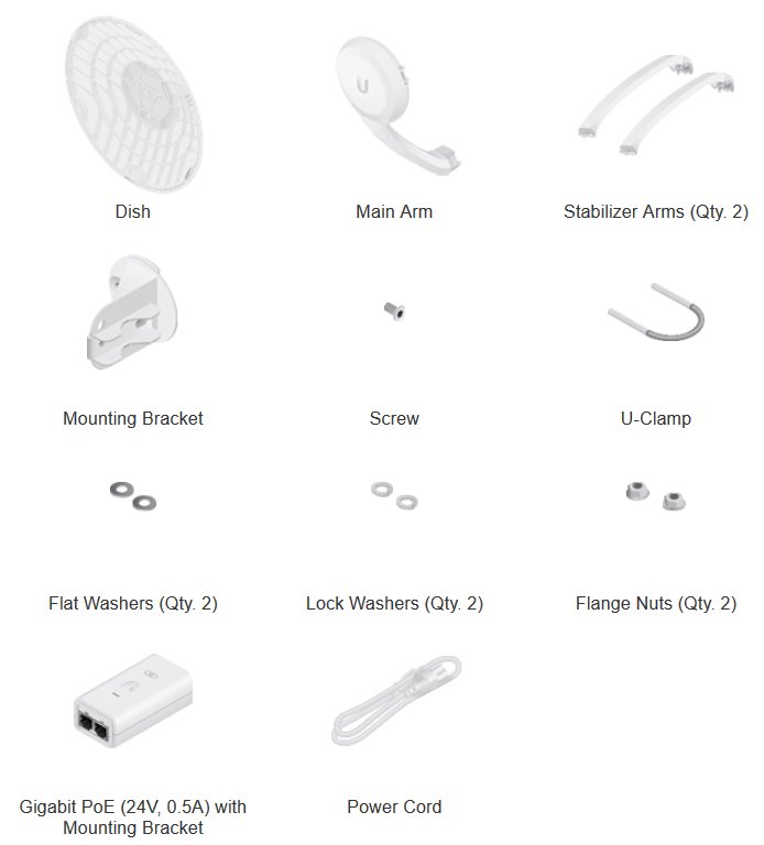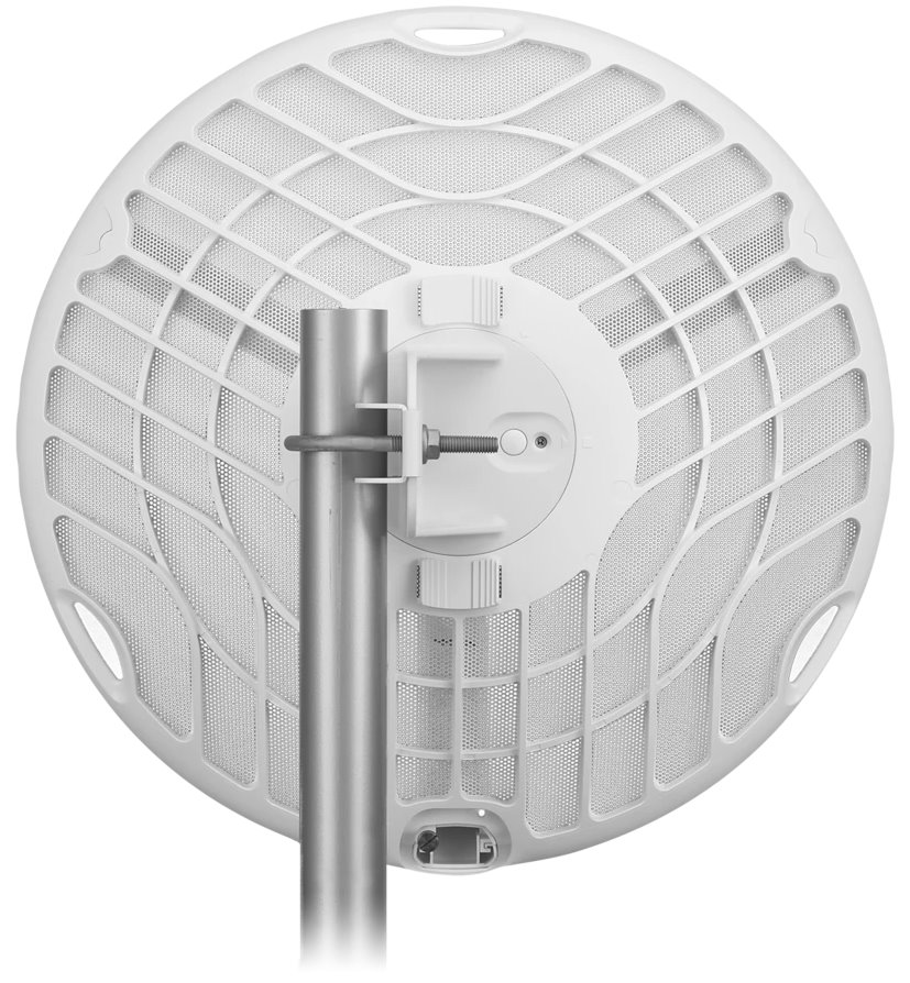 AirFiber 60 je velmi robustní jednotka složená z kovového držáku, sítové parabolické antény se ziskem 38dBi (v 5GHz pouze 11dBi) a 3 plastových nožiček držících zářič, který obsahuje hlavní 60GHz i záložní 5GHz rádiovou část a Gigabitový ethernetový port s pasivním 24V napájením.