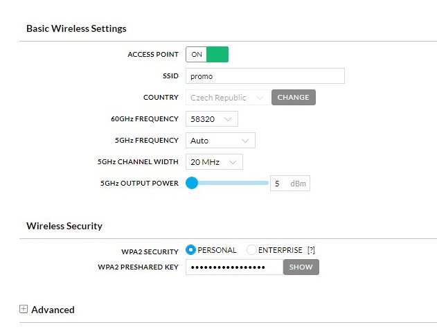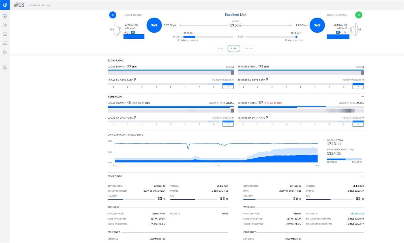 60GHz rádiová část má maximální modulační rychlost 4,6 Gbps při 16QAM modulaci. Záložní 5GHz linka je řešena pomocí 2x2 MIMO airMAX AC rádia s maximální modulační rychlostí 866 Mbps.